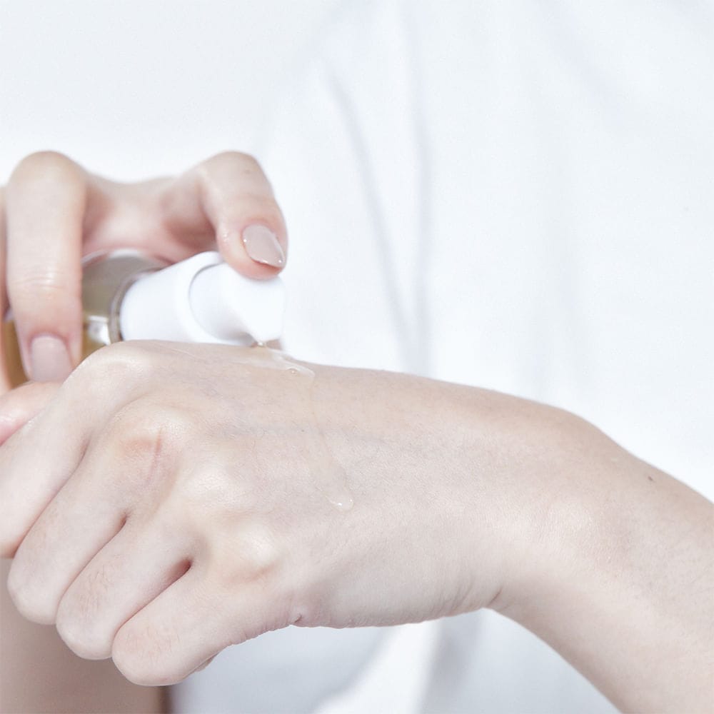 1️⃣ Aplica 1-2 pumps sobre la piel limpia.