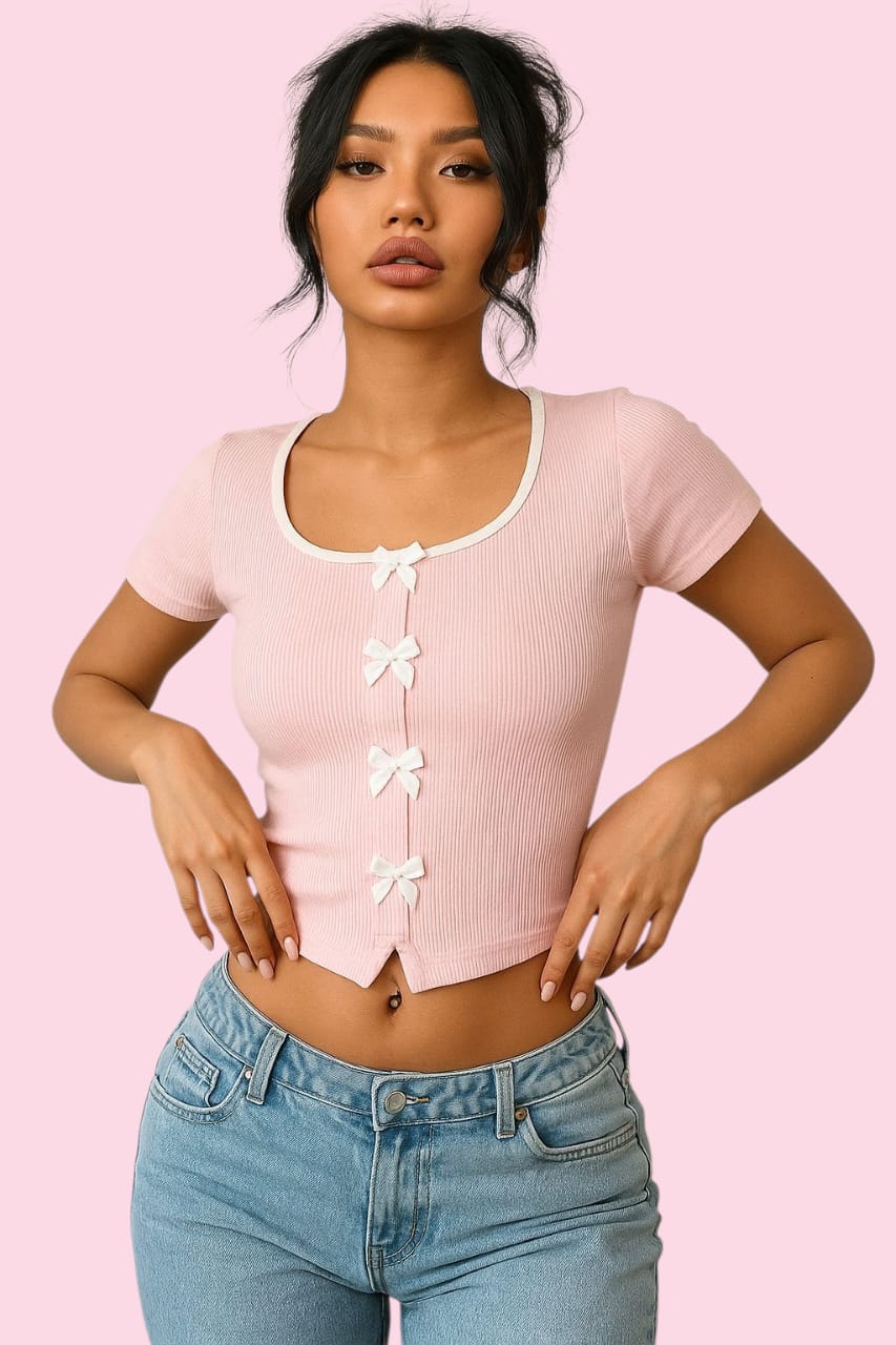 El Top Alice es perfecto para un look femenino y delicado. Con lazitos en el frente y disponible en rosa bebé, azul acero y perla, este top es ideal para cualquier ocasión.